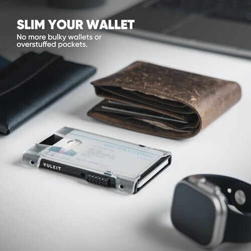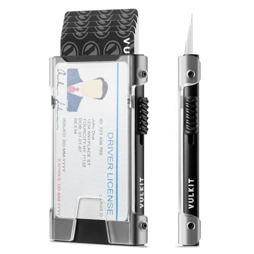 VULKIT minimalist card holder wallet for men combines a slim, durable aluminum build with a quick-access pop-up card mechanism for easy presentation of your cards. It includes an ID window, a secure money clip, and anti-slip grip for reliable daily use.