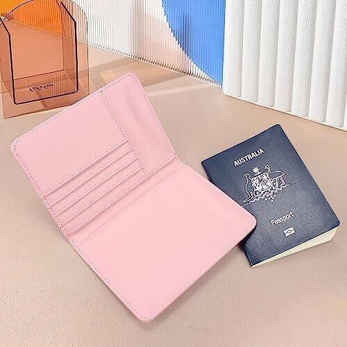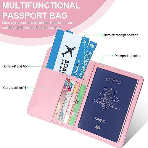 Stylish pink PU leather passport cover that protects your essentials with RFID blocking. Features multiple pockets for passport, boarding passes, tickets, and cards, plus a secure pocket layout for easy travel organization and durable everyday use.