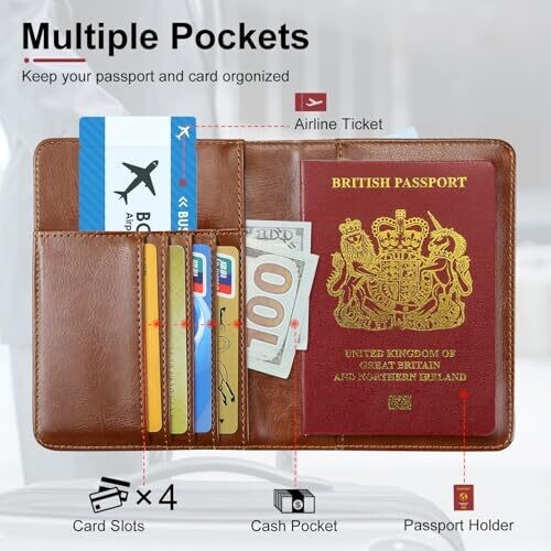 The design includes multiple card slots and a dedicated passport sleeve to organize travel documents, cards, and boarding passes.