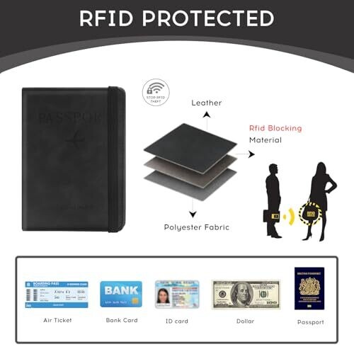 The product uses high-quality PU leather for durability and ease of cleaning. It includes multiple storage options to hold passports, business cards, credit cards, and boarding passes. It features RFID shielding material designed to block RFID signals and prevent unauthorized data access on cards and documents. The design is unisex and available in variations suitable for both men and women. The passport holder is lightweight and slim, intended to be convenient for travelers while still providing space for essential items.