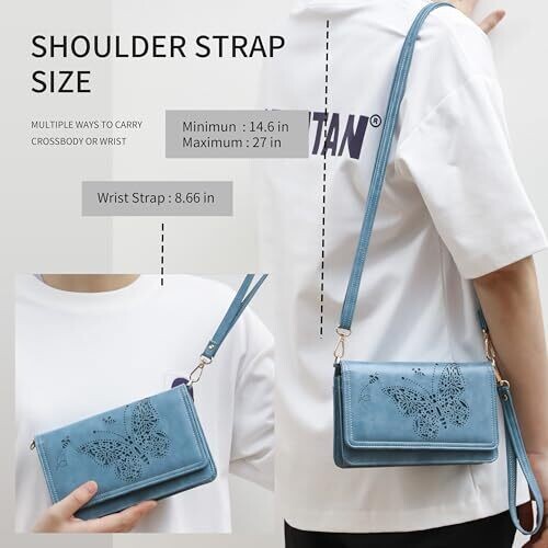 The product is a multi-function crossbody bag designed for women, offered in blue and described as small in size. It is constructed from premium vegan leather with a glossy surface and a gold zipper, featuring a butterfly pattern. The bag functions as a crossbody bag, a shoulder bag, or a wristlet wallet. Storage includes 1 main pocket and 1 interior zipper coin pocket, plus 7 card slots, 1 ID window, 1 front pocket, and 1 cellphone pocket. It supports RFID blocking functionality. Dimensions are 7.48 inches in length, 4.72 inches in height, and 1.96 inches in depth, with an extended shoulder strap for taller users. Fits most large smartphones up to 6.7 inches.