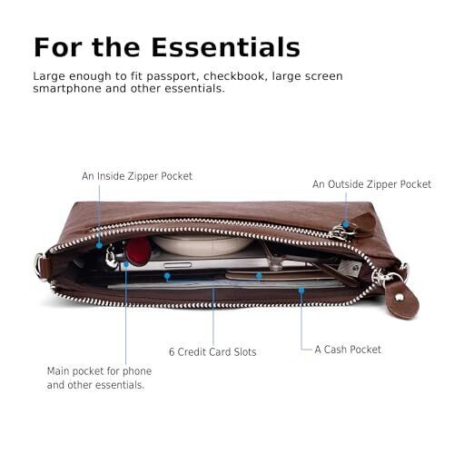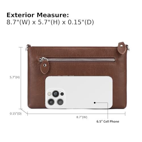 The product is made from premium vegetable-tanned leather. It functions as a multi-functional bag that can be used as a clutch, wristlet, or crossbody. It includes RFID blocking card slots. It is capable of accommodating most large smartphones, including models such as iPhone 15 Pro Max, 14 Pro Max, 13, XS Max, Samsung Galaxy S23 Ultra, S22, S21 Ultra, Note 8, Google Pixel 7a, 8 Pro, L6 Pro, and OnePlus 11 with slim cases, or any phone smaller than 6.7 inches. Exterior feature includes a zipper pocket on the back and an interior layout consisting of a full-length compartment with a slip pocket, six card slots, and an interior zippered pocket. Dimensions are 8.7 inches in width, 5.4 inches in height, and 0.15 inches in depth. The bag includes two removable straps: