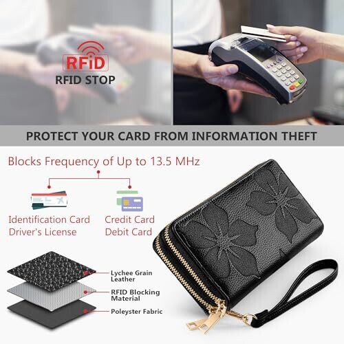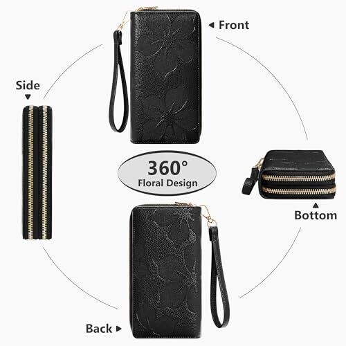 Espera Women Wallet RFID Blocking Large Capacity Card Holder Purse Double Zip Leather Designer Ladies Clutch with Wristlet, Black, 7.87 x 3.94 x 1.57
