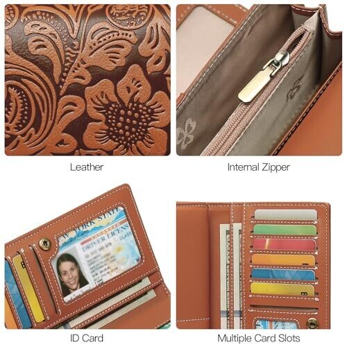 GOIACII Women's RFID Blocking Long Clutch Wallet In Vegan Leather—Embossed Flower, Brown