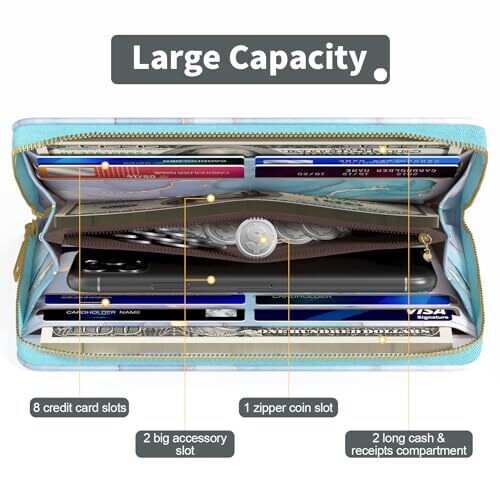 Dimensions 7.68 x 4.13 x 0.98 inches; holds more than 16 credit cards; contains 8 card slots, 1 zipper coin slot, 2 long cash/receipts compartments, and 2 large accessory slots; can accommodate an iPhone.