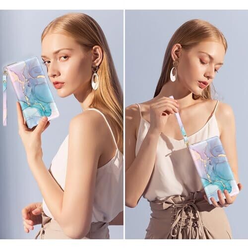 Nipichsha's RFID-safe wristlet wallet blends fashion and function for on-the-go days. The Colorful Ink Marble finish adds flair, while roomy card slots, a coin zipper, a built-in phone holder, and a detachable strap keep essentials organized and chic.