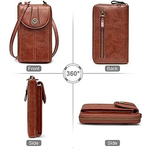 Product is a vegan leather crossbody purse with RFID blocking capabilities. Materials include reinforced stitching and bronze-tone metal hardware. The front pocket accommodates devices up to 6.7 inches. The overall design combines a front phone pocket with a main wallet compartment. Wallet features include multiple card slots (8 total: